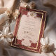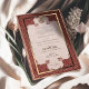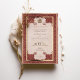 Diese exquisite Hochzeitseinladung vereint das Wesen der traditionellen muslimischen Ehe mit ihrem eleganten Spitzendesign in einer warmen, rubinen Farbe. Die zarten Feinheiten der Grenze bilden den Rahmen der Seite und führen das Auge zur heiligen islamischen Kalligraphie in der Mitte. Der altertümliche Pergament-Stil verleiht dem Ganzen ein Vintages Ambiente, während die verzierten Details an den Rändern mit der Pracht der klassischen muslimischen Kunst harmonieren. Die farbenfrohe Farbpalette verbrannter Orange mit Akzenten aus dunkler Terrakotta und subtiler Creme erinnert an einen Sonnenuntergang, der perfekt für einen Abend der Feier geeignet ist. Diese Einladung ist nicht nur ein Vorgeschmack auf die kommenden Nuptials, sondern auch ein Bewahrer kultureller Schönheit und Bedeutung.