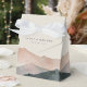 Delight your guests with this elegant wedding favor box from the Sierra Dusk collection by Redwood & Vine Design Co. Featuring a soft watercolor mountain design in peach and slate tones, customizable names and date, and a white satin ribbon closure, this box is a perfect fit for rustic elegant, mountain, or outdoor weddings. Fill with candy, mints, or small gifts for a stylish and memorable thank you.