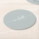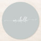 Girly Sage Green moderne Monogram Name Signature Script Custom Personalisiert Round Paper Untersetzer. Diese Design mit Ihrem Vornamen in einem hübschen handgeschriebenen Stil Swash Schwanz Schriftart Signatur Typografie auf schlangengrünen oder staubigen grünen Hintergrund. So einfach anzupassen. Große stilvolle feminine Hauswärmeschenke, auch zum Geburtstag, Hochzeit, süße 16 Geburtstagsparty, Brautparty, Muttertag, Babydusche, für Graduiertenfeier und Es ist für das Mädchen, das einzigartige minimale stilvolle Sachen Liebe.