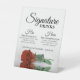 Dieses Tafelschild eignet sich perfekt für die Bar an Ihrem Hochzeitsempfang. Es zeichnet sich durch ein schlichtes, aber elegantes Design aus, mit einem Foto aus einem Single in einer orangefarbenen Rose, die in einem Wasserbecken mit Wellen und Wellen reflektiert. Das Schild lautet: Signature Drinks, und es gibt Platz für seinen Favoriten und ihren Favoriten.