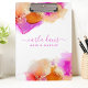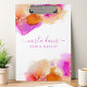 Entspannen Sie im Arbeitsbereich mit dieser lebhaften rosa und orangefarbenen Alkoholtupfer-Zwischenablage mit einem stilvollen Signaturskript. Dieses personalisierte Clipboard ist perfekt für Beauty-Profis, Künstler oder alle, die einen Flair für kühnes Design haben, geeignet und kombiniert Funktionalität mit beeindruckenden Bildern. Es ist ein idealer Schreibtisch-Accessoire für alle, die eine einzigartige, farbenfrohe Dekoration schätzen.