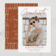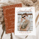Trendy Graduierungsparty lädt mit dem Foto des Absolventen auf der Vorderseite gerahmt durch eine weiße raue Grenze. "Graduate" wird in einer Terrakotta-Signatur-Skript mit dem Namen des Absolventen, Schulname und Abschluss Jahr angezeigt, wie unten gezeigt. Die moderne Graduierungsparty lädt die Reverses dazu ein, Ihre Graduiertendetails mit einem einzigartigen Terrakotta- und Weißstanzmuster-Hintergrund darzustellen. Diese Foto-Abschlussfeier lädt sowohl für Uni-Abschluss- als auch für Highschool-Party ein.