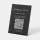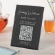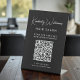 Das elegante schwarze Tischschild für Ihr Unternehmen mit Ihrem Namen in einem stilvollen, weißen Schrift und einem Geschäftstyp unten in einem sauberen, weißen Schriftzeichen. Geben Sie Ihre Website-Adresse ein, um einen QR-Code zu erstellen, den Kunden und Kunden nach Terminen, Produkten, Dienstleistungen, Stunden usw. durchsuchen können.