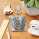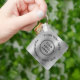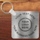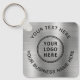 Einfaches Schlüsselanhänger für Ihr Unternehmen oder Ihre Organisation auf einem silberfarbenen Imitat mit metallischem Hintergrund. Fügen Sie Ihr Logo oder QR-Code und zwei Zeilen individueller Text, wie z. B. Ihr Firmenname, Slogan, danke, oder verlass leer.