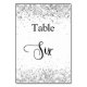 Die Tischnummer ist mit einem handgeschriebenen, eleganten Schriftsatz geschrieben. Schwarze Buchstaben, weißer Hintergrund vorne und Imitate silberer Hintergrund mit Imitaten Glitzer Staub, Glitzern auf der Rückseite.