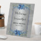 Silber schimmern: Blauer Blumenzauber Brautparty Pedestal Schild Fügen Sie Ihrer Brautparty-Feier eine Touch Glamour hinzu mit unserem schimmernden Silberwillkommen-Schild, mit dem bezaubernden blauen Blumen-Set vor einem Hintergrund glitzernden Silberes.