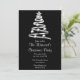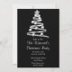 Ein silberner Weihnachtsbaum auf schwarzem Hintergrund. Die Rückseite der Einladung ist schwarz mit Schneemuster