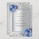 Imitat silber aussehend mit blauen Rose, Blume und Konfetti dekoriert. Personalisieren und fügen Sie Ihre Namen und Hochzeitsdetails. Schwarze Buchstaben.