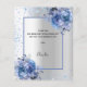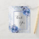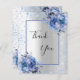 Imitate silber aussehender Hintergrund, dekoriert mit hellblauen Imitat Glitzer, Glitzern und blauen floralen.An der Vorderseite große handgeschriebene Drehbuch und den Text: Danke. Zurück: Personalisieren Sie Ihre Dankeschön Notiz und Namen.