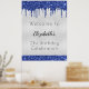 Ein Willkommensgruß für eine mädchenhafte und glamouröse Geburtstagsfeier (oder jedes Alter). Ein Imitat silber metallisch aussehender Hintergrund mit blauen Imitaten Glitzer Tropfen. Personalisieren und fügen Sie einen Namen und Alter. Schwarze Buchstaben.