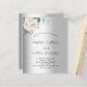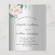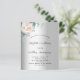 Ein Imitat silber aussehender Hintergrund. Weiße Blumen, Blume aus Pinien und grüne Eukalyptusgrün im Wasser. Personalisieren und fügen Sie Ihre Namen und die Details. 1 Blatt = 1 Einladung mit Druckkante bis Kante.