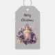 Silber grau und Nostalgisch Frohe Weihnachtsgeschenk Tag. Illustration des exklusiven Parfums, umgeben von violetten Blumen und tanzenden Schneekristallen. Die Rückseite des Tags ist Design Free, sodass Sie Ihre Nachricht schreiben können oder ... und von... Doppelseitig. Ein nostalgisches, gutes, altmodisches Weihnachtsfest.
