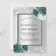 Imitate silber aussehender Hintergrund mit grünen Blumen, Blume und Imitate silberne Glitzer, Glitzern. Personalisieren Sie Ihren Namen und Ihre Party-Daten und fügen Sie diese hinzu. Schwarze Buchstaben.