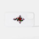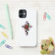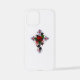 Silberkreuz mit einer rote Rose und schwarze Blätter auf weißem Hintergrund.