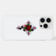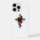 Silberkreuz mit einer rote Rose und schwarze Blätter auf weißem Hintergrund.