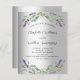 Ein Imitat silber aussehender Hintergrund. Mit Lavendel-Blume und Eukalyptusgrün dekoriert. Personalisieren und fügen Sie Ihre Namen und die Details. 1 Blatt = 1 Einladung mit Druckkante bis Kante.