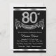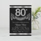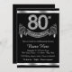 Elegante Schwarz und Silber 80. Geburtstagsfeier Einladung mit Diamantenzahlen und Banner auf silber und schwarz Hintergrund. Diese schöne silber und schwarz 80. Geburtstagsfeier lädt zu einer ganz besonderen Veranstaltung ein. Sie können die Hintergrundfarbe ändern. Dieses auffallende Design funktioniert gut für einen Mann oder eine Frau. Dies ist ein gedrucktes Design ohne echte Diamanten, Silber, Glitzer, etc.