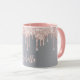 Eine elegante, mädchenhafte und glänzende Tasse. Imitate Rose Gold Tropfen, malen Tropfen. Chic Imitats silber aussehend Hintergrund. Template für Ihren Namen geschrieben mit einem handgeschriebenen Stil Skript. Rose goldfarbene Buchstaben.