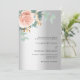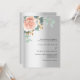 Ein Imitat silber aussehender Hintergrund. Dekoriert mit einer Rose Gold und rot rosa Blumen, Rose Blume und grüne Aquarell Eukalyptusgrün und Imitat goldenen Sprigs. Personalisieren und fügen Sie Ihre Namen und Hochzeitsdetails.