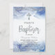 Moderne, silberne und blaue Taufe-Einladung mit Silberkreuz, Typografie-Drehbuch ''Taufe'' und Imitat Glitzer Rahmen. Personalisieren Sie Ihre Daten mit einem Namen und Details.