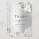 Ein modernes und elegantes Non-Foto Dankeschön Karte. Ein Imitat silber aussehender Hintergrund. Weiße Rosen, Blume mit Blumenmuster und weiße Spitzen. Auf der Vorderseite der Text: Danke Zurück: Vorlage für Ihren Dank Notiz und Namen.