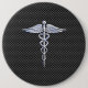 Das symbolische Chrom wie Caduceus-medizinischer Symbolentwurf stellte sich hier auf einem schwarzen Kohlenstofffaserart-Druckhintergrund dar. Die Caduceusschlangen ist entworfen, um zu schauen, wie es vom Chrom gemacht wird. Gut für eine Abschlussgelegenheit, eine Aussage für Ihren Beruf oder für ein Geschenk mit dem suchen der medizinische Ihr Blick.