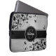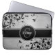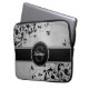 Girly silberner schwarzer BlumenWirbels-personalisierte Laptop-Hülse. Spaß, dennoch berufliches, dieses personalisierte Silber bürsteten StahlFoto und Schwarzwird BlumenWirbelsmuster AUF EINER STOFF-Laptophülse GEDRUCKT. Geben Sie eine Modeerklärung mit Ihrer Monogramminitiale und -namen auf einem Kreisumbau mit einer schwarzen Linie auf BlumenWirbel ab zu kopieren und ein fester silberner Hintergrund.