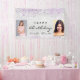 Ein Banner für eine mädchenhafte und glamouröse Geburtstagsparty für zwei Mädchen, Frauen. Ein Imitat silber metallisch aussehender Hintergrund mit lila und Imitaten silberner Glitzer Staub. Fügen Sie Ihre eigenen zwei Fotos der Geburtstagsmädchen hinzu. Text: Herzlichen Glückwunsch zum Geburtstag. Das Wort Geburtstag und die Namen sind mit einem modernen handgeschriebenen Stilskript geschrieben. Kann als Begrüßungsbanner und als Party-Wanddekoration verwendet werden.