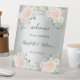 Ein Begrüßungsbrett für eine Hochzeit. Stilvolle Imitat mit silberfarbenem Hintergrund, die mit rosafarbenen und weißen Blume geschmückt sind. Personalisieren und fügen Sie Ihre Namen und das Hochzeitstermin. Schwarze Buchstaben.
