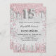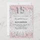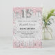 Eine moderne, stilvolle und glamouröse Einladung für eine Girl's Quinceañera, 15. Geburtstagsfeier. Ein Imitat silber aussehender Hintergrund, dekoriert mit rosa und Imitaten silberne Glitzer Staub. Personalisieren Sie Ihren Namen und Ihre Party-Daten und fügen Sie diese hinzu. Nummer 15 wird mit einem Schriftart im Ballonstil geschrieben, Skript.