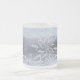 Schöne, silberne, kristallklare Eisschneeflocken mit einem hübschen Scrollwerk auf einer mattierten Tasse.