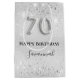 Elegante, klassische, glamouröse 70. Geburtstagsfeier. Ein silberner metallischer Hintergrund. Dekoriert mit Staub aus Glitzer. Personalisieren und einen Namen hinzufügen. Mit dem Text: Happy Birthday. Der Name ist mit einem modernen handgeschriebenen Stilskript geschrieben. Nummer 70 wird mit einem Schriftart im Ballonstil geschrieben.