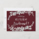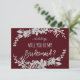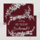 Werden Sie meine Brautjungfrau auf einer modernen, hübschen schicken und eleganten Rose goldskript Floral rot burgund Hochzeitskarte mit handgemalten silbernen Blattwerk und Imitaten silberne Typografie. Der rote Farbhintergrund ist vollständig anpassbar. Ideal für elegante, elegante Hochzeiten