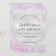 Eine moderne, elegante Einladung zum Geburtstag. Imitate silberfarbener Hintergrund mit Glitzern aus lila Imitaten, einem rosa Schmetterling und einem silbernen Schmetterling als Wasserzeichen. Personalisieren und fügen Sie Ihre Namen und Hochzeitsdetails. Schwarze Buchstaben.