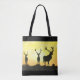 Ein farbiges Bild von drei Stags, die an einem goldenen Himmel silhoutiert sind. Trage den ganzen Tag ein Stück Originalkunst mit dir herum!