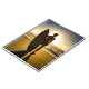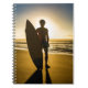 Ein Surfer stehend am Strand, mit Surfbrett in der Hand, vor dem Ozean, silhouettiert gegen die aufgehende Sonne.