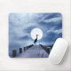 Dieses Mauspad verfügt über eine Silhouette eines Helden, der auf einem Pier vor einem Vollmond stehend ist. *