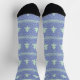 Diese hübschen Socken eignen sich perfekt für die Feiertagssaison, können aber auch den ganzen Winter hindurch gut laufen. Sie weisen ein sich wiederholendes Muster von Imitaten Strick Silhouette Baumstruktur Bilder. Die hellen Bilder werden auf einem mittelblauen Hintergrund platziert. Dekorative Streifen trennen die Bildreihen, während zarte Schneeflocken über alles fallen.