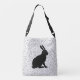 Dieses Ganze im Druckkörper-Überlaufbeutel hat ein schwarzes, sitzendes Kaninchen mit hohen Ohren in Silhouette auf weißem Hintergrund mit schwarzen Polka-Punkten.