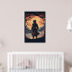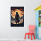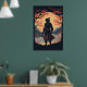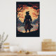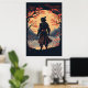 Silhouette eines Samurai-Kriegers mit Mond, Bergen und blühenden Bäumen.