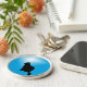 Silhouette einer schwarzen Katze, die vor einem blauen Hintergrund einen hellen Stern sieht.
