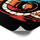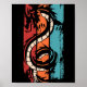 Ein stilisierter Drache wird vor einem Hintergrund von vertikalen Streifen in lebhaften Vintagen Farben dargestellt. Die Form des Drachen ist minimalistisch und konzentriert sich auf seine mächtige Silhouette und fließende Linien. Die Ästhetik erinnert an Retro-Design-Trends mit einer Touch von Grunge und urbanem Flair.