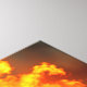 Ein Pelikan steht auf einem Strand, der von einem blühenden Feuer am Horizont gedämpft wird
