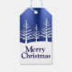 Weihnachtsgeschenktafeln mit weißen Kiefernbaum-Silhouetten auf schneebedeckten Hügeln gegen einen dunkelblauen Himmel und "Frohe Weihnachten" Gruß. Beispiel-Meldung auf der Rückseite, um durch Ihren eigenen Text zu ersetzen.