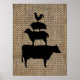 Große rustikale Gestaltungsmerkmale: gestapelte Silhouetten von Nutztieren (Hahn, Schwein, Schafe, Kuh) auf dem Hintergrund der Bestückung