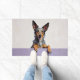 The soft misty lavender-gray background adds a calm and sophisticated touch, perfect for welcoming entryways. Designed with extra space at the top and bottom, it allows easy personalization with names, welcome messages, or custom text—making it ideal for unique dog-themed doormats and thoughtful gifts.