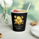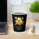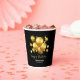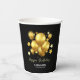 Eleganter Geburtstagstorapier-Becher mit goldenen Ballons und glitzernden Sternen auf einem schwarzen Hintergrund.