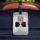 Personalize for business traveler; black name and monogram on green and silver box on silver metal background. Has QR code and your logo with contact info on back.