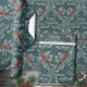 Ein elegantes, raffiniertes und festliches Urlaubspapier mit silberblauen Fichtenzweigen und roten Beeren in Gitterformation auf tiefgrünem Schiefergrün mit den Worten "Frohe Weihnachten", geschrieben in einer silbernen Hand geschrieben Pinselstrich in den Gitterfenstern.