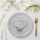 Schöne, silbergraue Calla Lily Papier Teller mit floralen Damast Hintergrund für einen 25. Hochzeitstag. Elegantes silbernes Banner ist mit zwei Calla Lilies akzentuiert und hat Text Art Sprichwort 25. Jubiläum in verzierter Schrift. Der obere Text ist für Sie bereit, um die Namen und Jubiläumsdaten anzupassen.